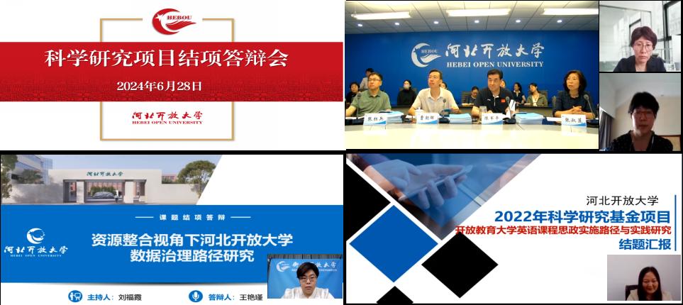 根據《河北開放大學科研項目管理辦法》關于科研項目結項鑒定的相關要求,6月28日上午,我校在智學樓一樓雙向視頻會議室舉辦了2024年上半年校級科研項目結項答辯會。會議邀請體系內5位專家組成評審組,由學校黨委常委、副校長、校學術委員會副主任陳軍平任組長,對此次申請結項的所有校級科研項目進行了嚴格的評議鑒定。會議采用“現場+遠程視頻會議”的形式進行,省校在研校級科研項目負責人現場參會,體系內在研校級科研項目負責人及項目組成員、市校科研管理人員以及對科研感興趣的部分教師在線觀摩學習。會議由科研與規劃處處長張淑蓮主持。