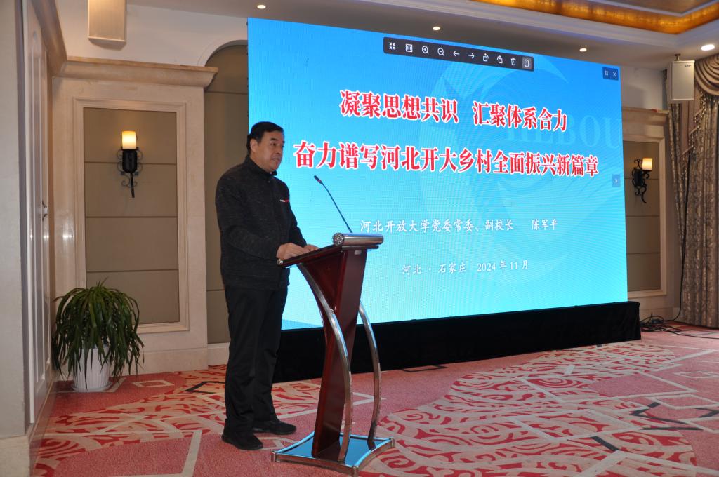 陳軍平作題為《凝聚思想共識、匯聚體系合力、奮力譜寫河北開大鄉村全面振興新篇章》的主旨講話。從黨和國家關于鄉村振興的大政方針推進、全國開大體系服務新時代鄉村人才振興新路徑探索、河北開大體系多元化促進人才培養質量與鄉村振興需求精準對接取得新成效等三個維度進行了闡述。最后,號召全體系要始終保持高度的政治責任心,時刻牢記踐行為黨育人、為國育才的初心使命;始終保持久久為功的奮斗精神,不斷推動鄉村振興工作向縱深發展;始終保持與時俱進的創新理念,不斷探索服務鄉村振興的新路徑。