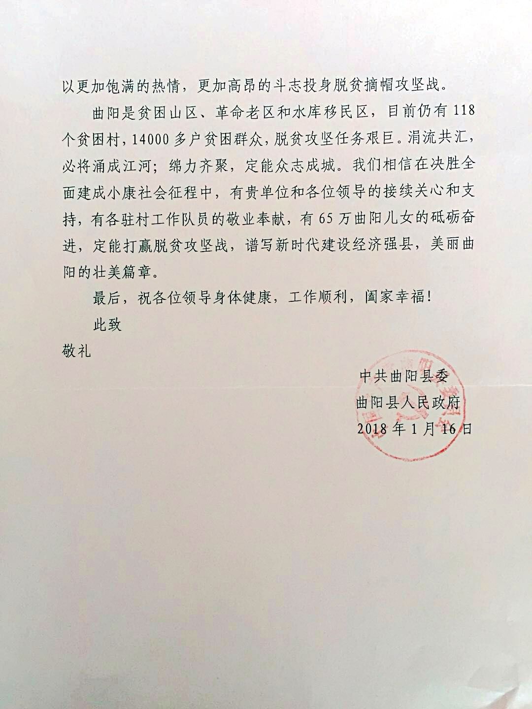 中共曲陽(yáng)縣委致我校的感謝信