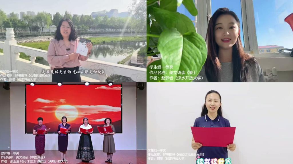 本次讀書日主題活動分為教師組和學生組兩個組別,采用美文誦讀或好書推薦形式,體系師生積極響應、廣泛參與,共收到參選視頻作品76份。作品內容豐富,思想健康,制作精心,經評審委員會認真評選,評選出教師組一等獎2人,二等獎4人,三等獎8人;學生組一等獎2人,二等獎4人,三等獎6人;優秀組織獎3個。